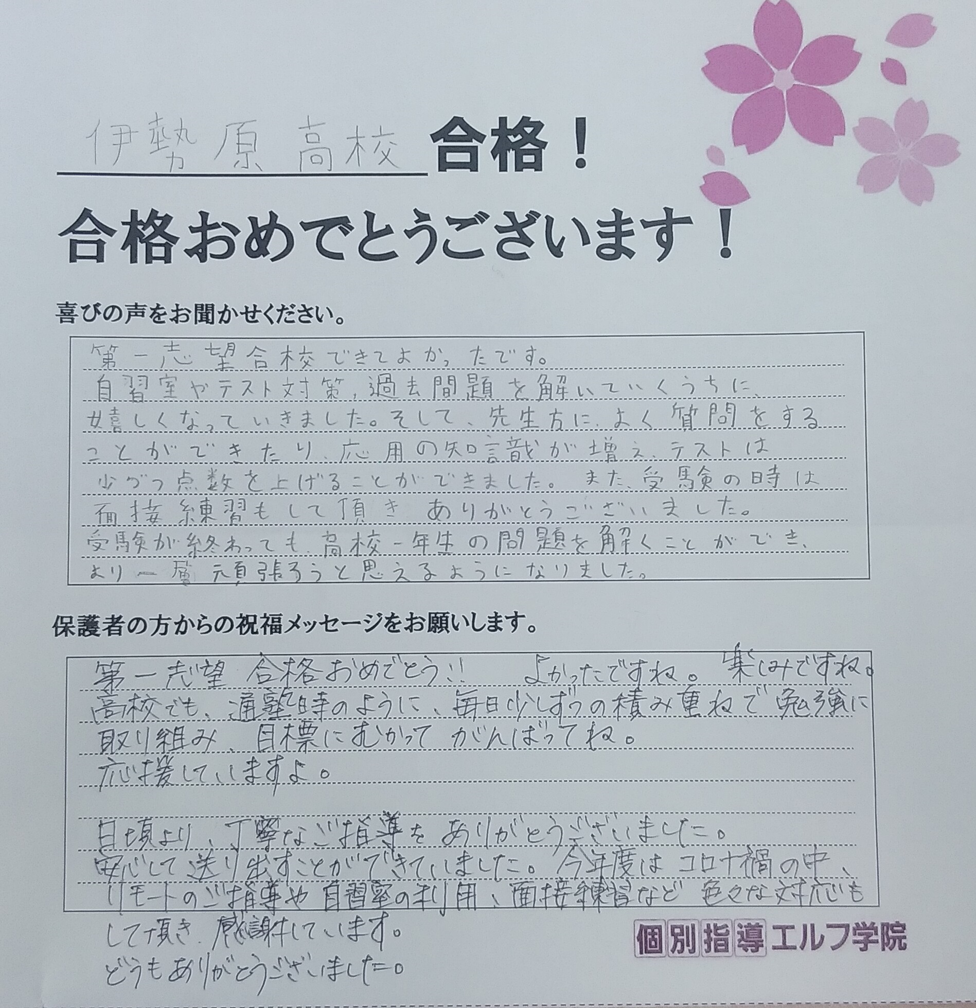 コロナ禍での初めての受験、初めは不安でいっぱいでしたが、エルフ学院の先生が毎回の授業で丁寧に教えてくれたので、志望校のレベルを上げるという決断が下せるほど、成長することができました。